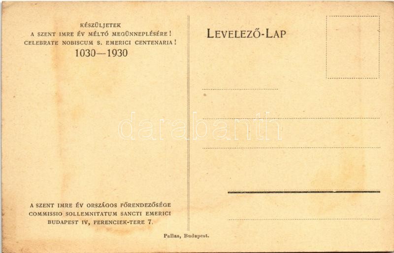 Szent Imre. Készüljetek a Szent Imre Év méltó megünneplésére! 1030-193... https://www.darabanth.com/hu/381-Gyorsarveres/381.0/Kepeslapok/Vallas~1500074/Szent-Imre-Keszuljetek-a-Szent-Imre-Ev-melto-megunneplesere-1030-1930-Sanctus-Emericus-~II2258034