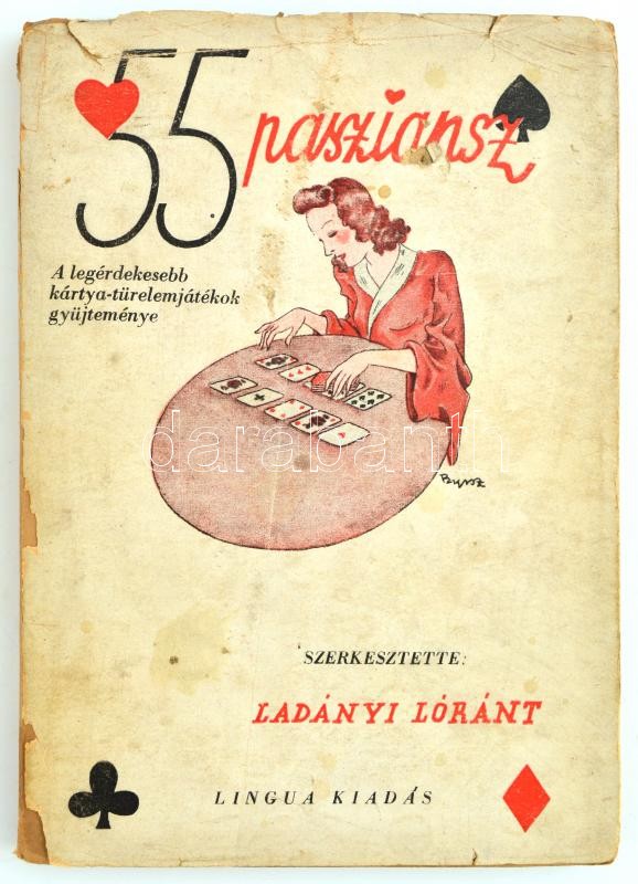 Ladányi Lóránt (szerk.): 55 pasziánsz (A legérdekesebb egy- és kétszemélyes kártya-türelemjátékok gyűjteménye), Budapest, é. n., Lingua kiadó, kiadói papír kötés, kiadó szakadt és hiányos papír védőborítóval. Előzéklapon tulajdonosi névbejegyzéssel.