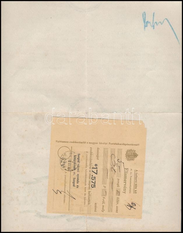 +Benne a szegedi nyomdától Rainer Károly (1875-1952) építész részére szóló levéllel, melyben felhívják Dános Árpád most megjelent művére, amelyet mellékelnek, fejléces papíron, aláírással.