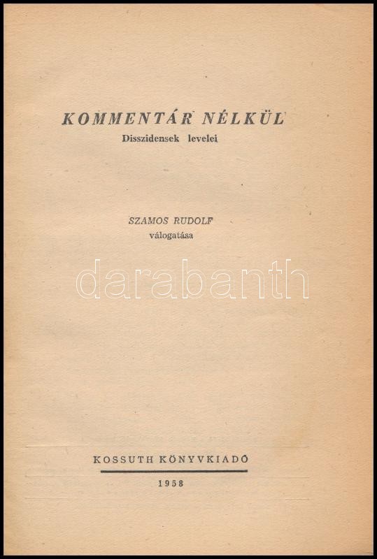 Kommentár nélkül. Disszidensek levelei. Szamos Rudolf válogatása. Bp.,... https://www.darabanth.com/hu/381-Gyorsarveres/381.0/Konyvek/Konyvek-Tortenelem~1000004/Kommentar-nelkul-Disszidensek-levelei-Szamos-Rudolf-valogatasa-Bp-1958-Kossuth-128-p-K~II2243325