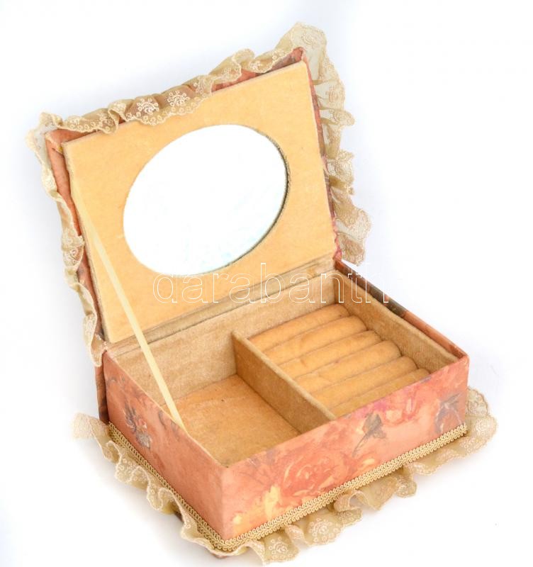 Leírás: Bársony bélésű, díszes, csipkés piperedoboz, 21x16x8 cm