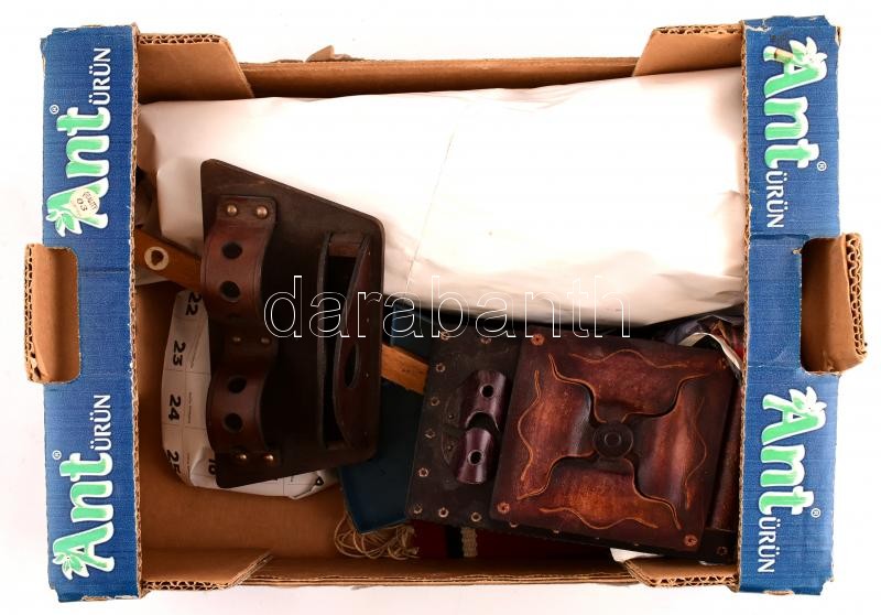 Leírás: Doboznyi bolhapiaci tétel, benne irattáska, váza, dísztárgyak, bőr íróasztali kellékek