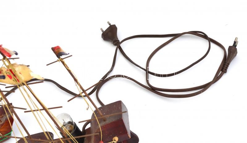 Leírás: 2 db fa hajó alakú elektromos lámpa, sérült, hiányos, nem kipróbált, h: 15 cm, m: 22 cm és h: 19 cm, m: 28 cm