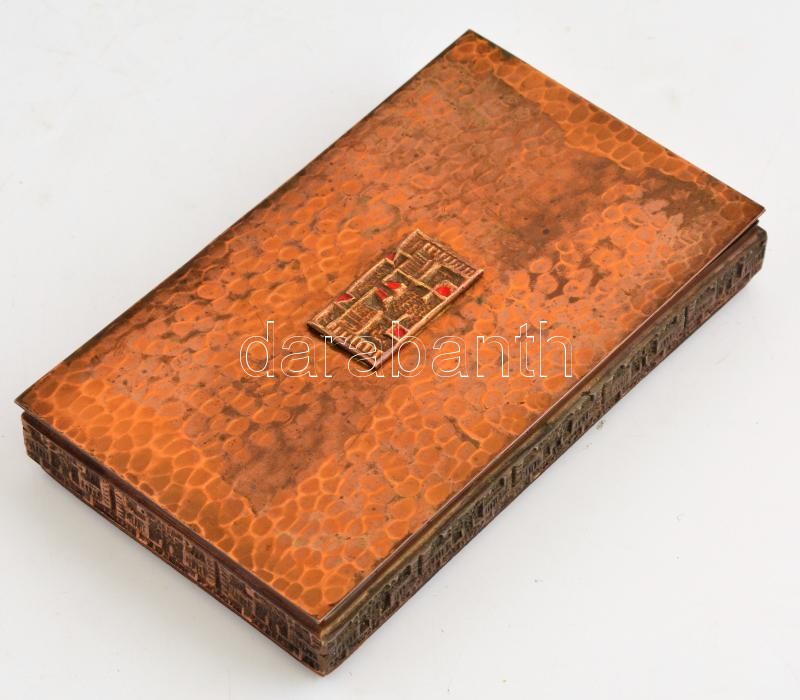Leírás: Móga Sándor (1927): Geometrikus domborműdíszes réz dobozka fa béléssel, jelzett, egyiok zsanér sérült 14,5x8,5x2,5cm
