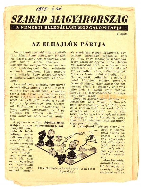 1955 Szabad Magyarország. A Nemzeti Ellenállási Mozgalom lapja. 6. sz., érdekes írásokkal Nagy Imréről, Rákosi Mátyásról, 10 p.. Lap tetején kézzel írt 1955.V hó. datálással, apró szakadásokkal.