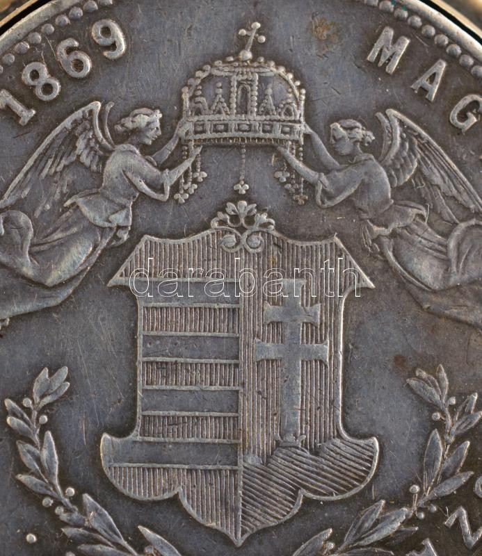 Leírás: Egyedi ékszer. 1869 Ag 1Ft érme, hátoldalán Ag lap monogrammal,14 k jelzetlen arany foglalatban