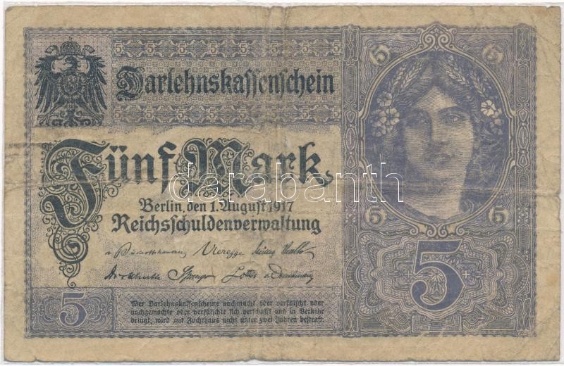 German Empire 1917. 5... https://www.darabanth.com/hu/381-Gyorsarveres/381.0/Numizmatika/Kulfoldi-bankjegyek~2000013/Nemet-Birodalom-1917-5M-lezart-foliaban-TIII--German-Empire-1917-5-Mark-in-enclosed-foil-CF~II2197279