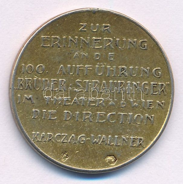 Austria 1901. "For the Brother Straubinger operetta 100th performance in the Theater of Wien" commemorative token gilded Ag. Sign: Warchmann (5,68g/23mm) C:VF,F