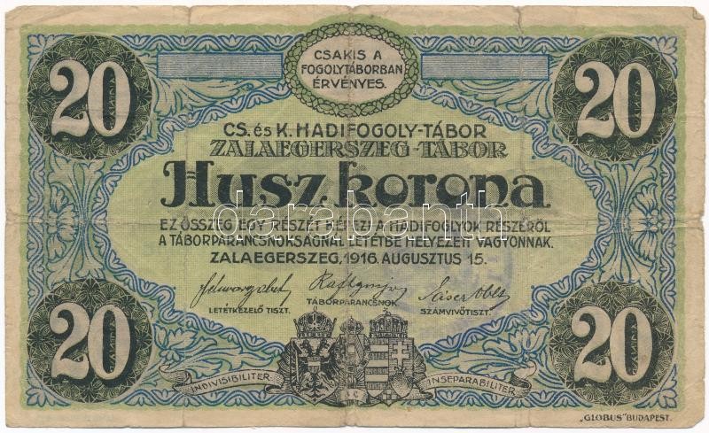 Zalaegerszeg / hadifogolytábor 1916. augusztus 15. 20K arab sorozat- és sorszámmal, 35mm-es körbélyegzéssel T:III- / Hungary / Zalaegerszeg / POW Camp 15.08.1916 20 Korona with arabic series and serial number, with 35mm round cancellation C:VG Adamo HHZ-1.7.7E