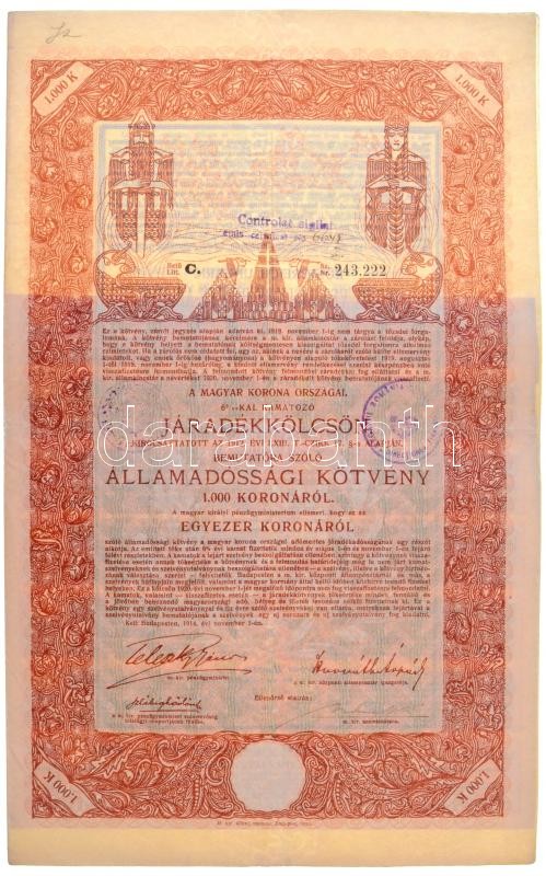 Leírás: Budapest 1914. "A Magyar Korona Országai 6%-kal kamatozó járadékkölcsön" 1000K-ról, szelvényekkel, szárazpecséttel és román felülbélyegzésekkel T:III