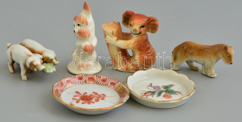 Mini porcelán tétel, közte mini tálkák, kutya, disznó, stb. figurák, matricás/kézzel festett, némelyiken jelzéssel (Herendi, Aquincumi), egyiken lepattanással, repedéssel m: 4,5 cm, 6 cm, 2,5 cm, 3 cm, d: 5,5 cm