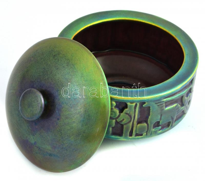 Leírás: Zsolnay eozin mázas cukordoboz. 60-as évek, ritka. Jelzett, apró karcokkal. d: 14 cm, m: 10 cm