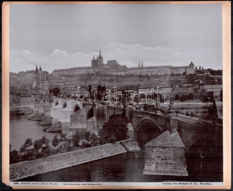cca 1900 Bp., a Királyi vár és várbazár, háttérben a lánchíddal, fotó kartonon/ a hátoldalán a prágai Károly-híddal és a Kisoldallal, Drezda, Stengel & Markert, 23x28 cm
