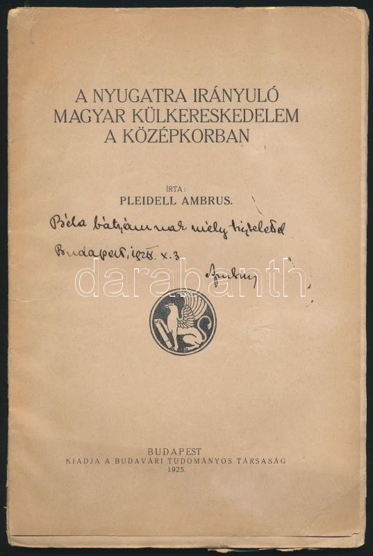 Pleidell Ambrus: A nyugatra irányuló magyar külkereskedelem a középkorban. Bp, 1925, A Budavári Tudományos Társaság kiadása. Papírkötésben, kissé szakadt állapotban. A Debreceni Kereskedelmi és Iparkamara bélyegzőjével ellátott, a szerző által dedikált példány.