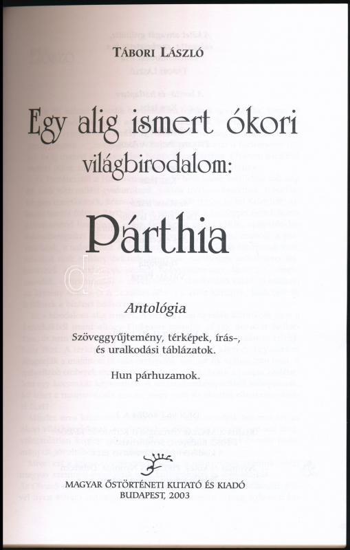 Tábori László: Párthia - Egy alig ismert ókori világbirodalom. Szöveggyűjtemény, térképek, írás-, és uralkodási táblázatok. Hun párhuzamok. Bp, 2003, Magyar Őstörténeti Kutató és Kiadó. Papírkötésben, szép állapotban.