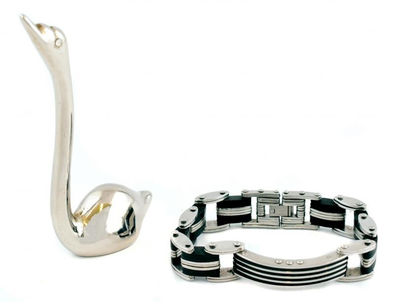 Leírás: Rozsdamentes acél és kaucsuk óraszíj, h. 21 cm + Fém hattyú formájú gyűrűtartó, feltehetően hiányzó talapzattal, m: 10,5 cm