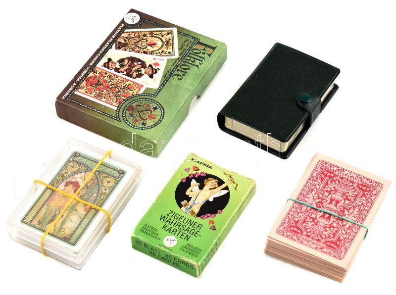 Leírás: Érdekes kártyapakli tétel, 6 csomag, közte két pakli népviseletes, egy nem lekerekített sarkú Piatnik, egy pakli Mucha hátlappal, jóskártya.