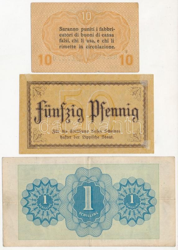 Austria / Allied occupation 1944. 1 Schilling + Italy / Venice / Austro-Hungarian occupation 1918. 10 Centesimi + German Empire / Detmold 1918. 50 Pfennig notgeld necessity note C:XF-F