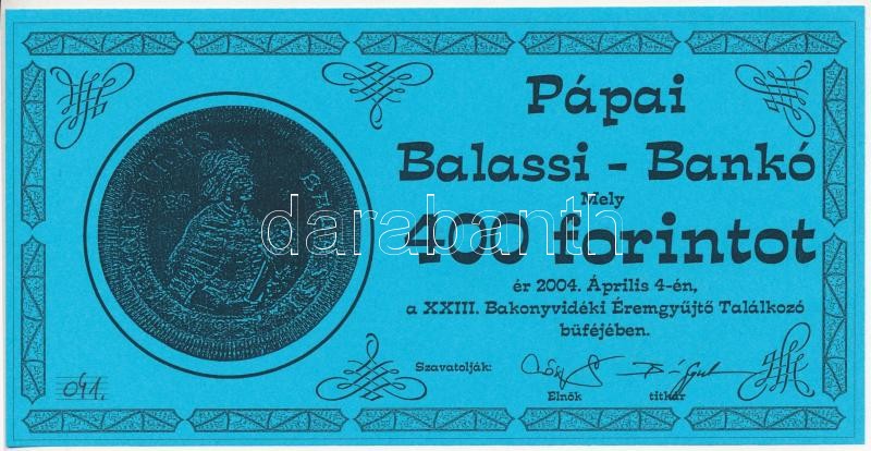 Leírás: Pápa 2004. "23. Bakonyvidéki Éremgyűjtő Találkozó" 400Ft Balassi-bankó, hátoldalán "MÉE Pápai Csoport" bélyegzéssel T:I