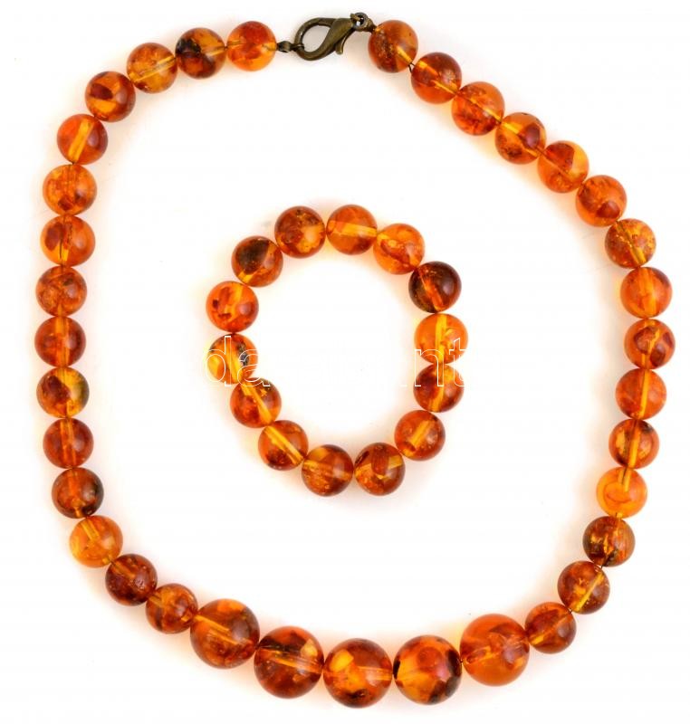 Leírás: Borostyán nyaklánc és karkötő, h: 51 cm, d: 8 cm
