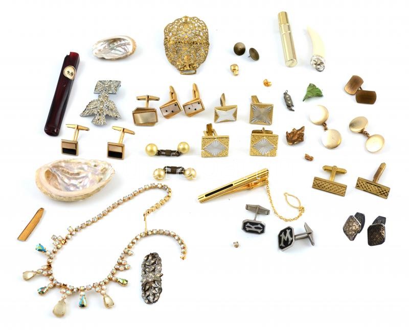 Vegyes bizsu tétel, közte 7 pár mandzsetta gomb, nyaklánc, nyakkendő tű, fog szerű medál, további 3 medál, 2 kagyló...stb. Dobozban, változó állapotban.
