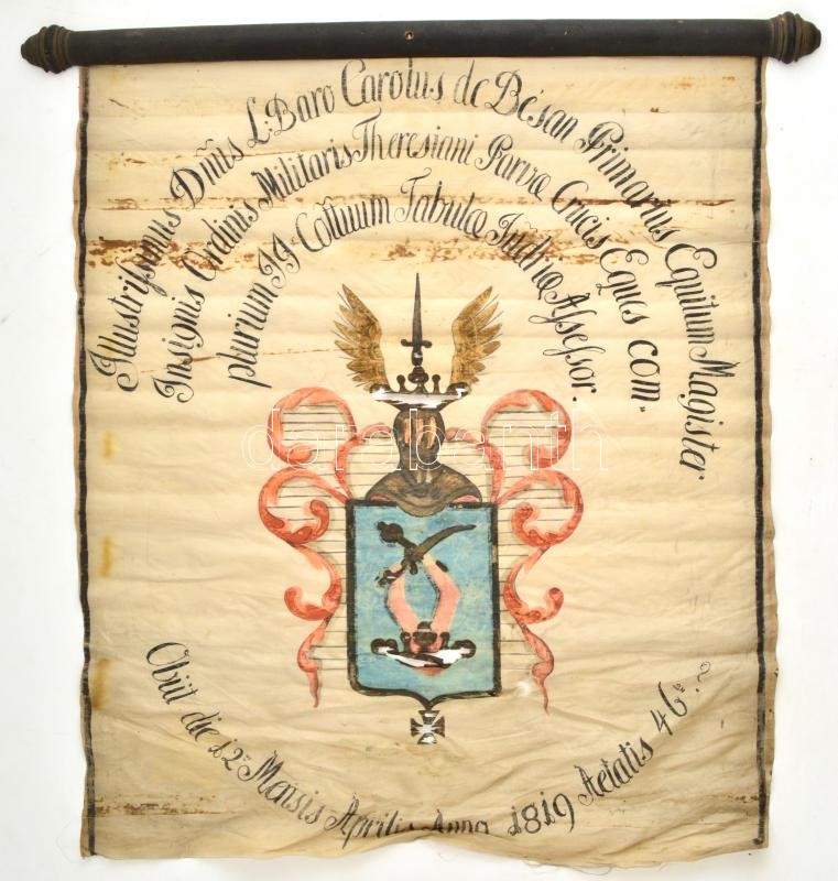 cca 1890 Báró Bésán Károly halotti zászló. Festett selyem, szakadt, ro... https://www.darabanth.com/hu/383-Gyorsarveres/383.0/Mutargy-papirregiseg-egyeb/Tortenelmi-dokumentumok-keziratok-erdekessegek~500018/cca-1890-Baro-Besan-Karoly-halotti-zaszlo-Festett-selyem-szakadt-rossz-allapotban-66x66-~II2285898