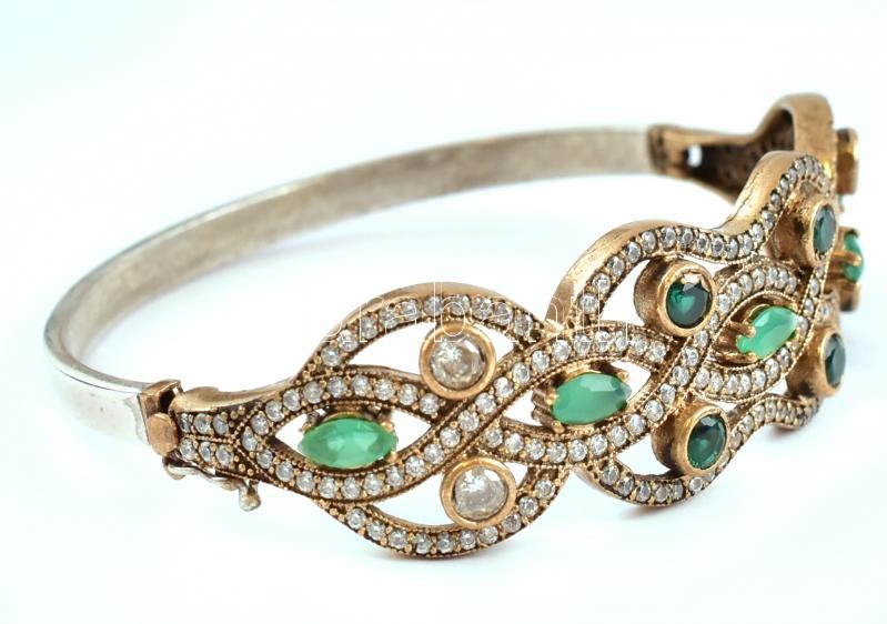 Leírás: Aranyozott ezüst(Ag) kövekkel gazdagon kirakott karperec, jelzett, 5×5,5 cm, bruttó: 19,33 g