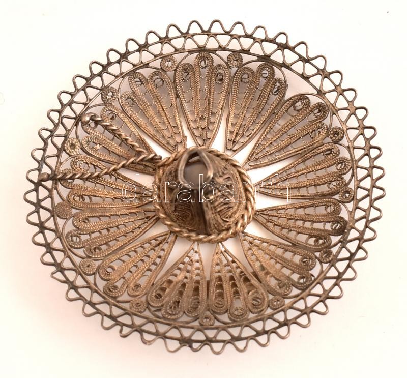Leírás: Ezüst(Ag) Sombrero alakú filigrán bross, jelzett, d: 6,5 cm, nettó: 21,25 g