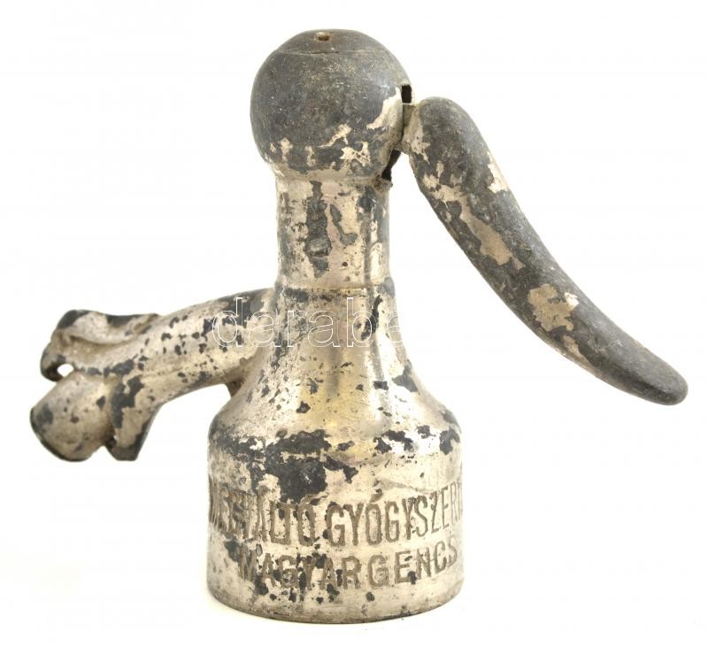 Leírás: 1935 'Megváltó Gyógyszertár, Magyargencs/Vető Sándor, Bp', feliratú fém szódásüvegfej, 'madárfejes' kiöntő résszel, jelzett, kopott, 10x7 cm
