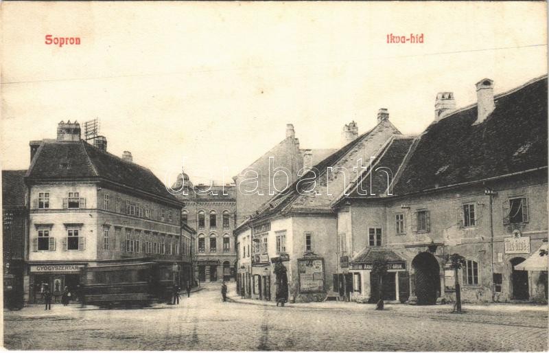 Leírás: 1914 Sopron, Ikva híd, Tűzőrség, arany és ezüst áruk, gyógyszertár, villamos
