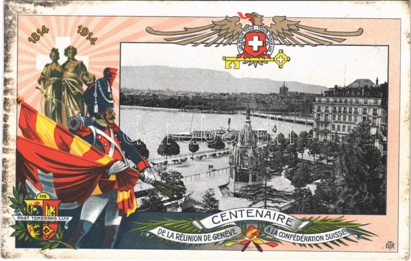 1814-1914 Geneva, Genf; Centenaire de la réunion de Geneve a la confédération Suisse, Post Tenebras Lux / 100th anniversary of the Geneva meeting of the Swiss confederation Art Nouveau, flags, coat of arms, litho