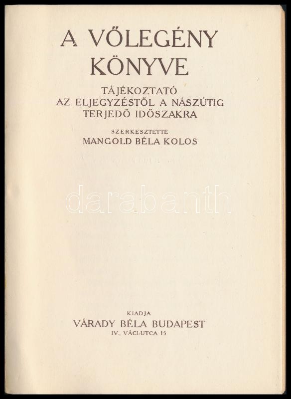 Leírás: A vőlegény könyve. Szerk.: Mangold Béla Kolos. Bp., én., Várady Béla. Kiadói papírkötés.