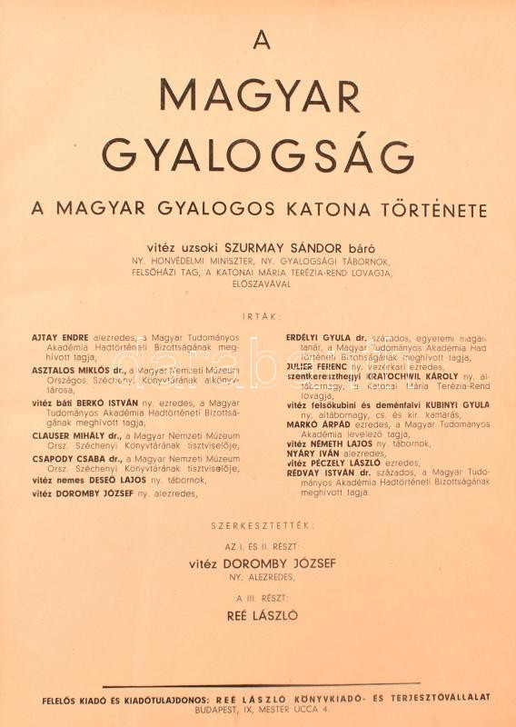 Ajtay Endre et al: A magyar gyalogság. A magyar gyalogos katona története. Bp., é. n., Reé László Könyvkiadó- és Terjesztővállalat. Számos érdekes képpel és írással. Kiadói, aranyozott egészvászon kötésben, kis kopásokkal