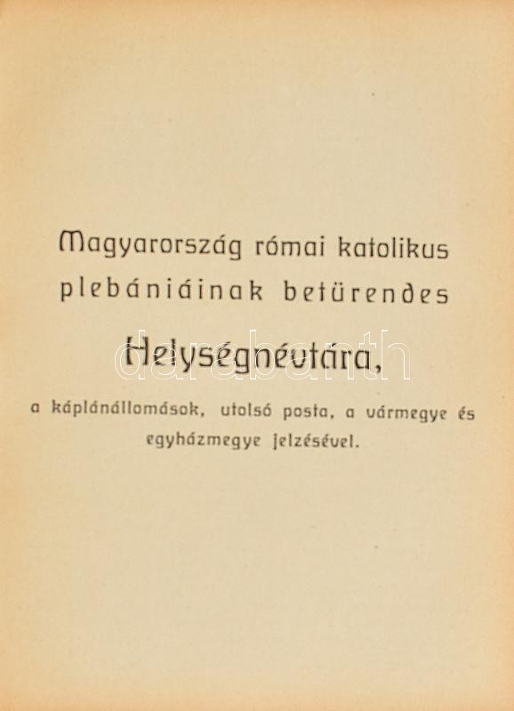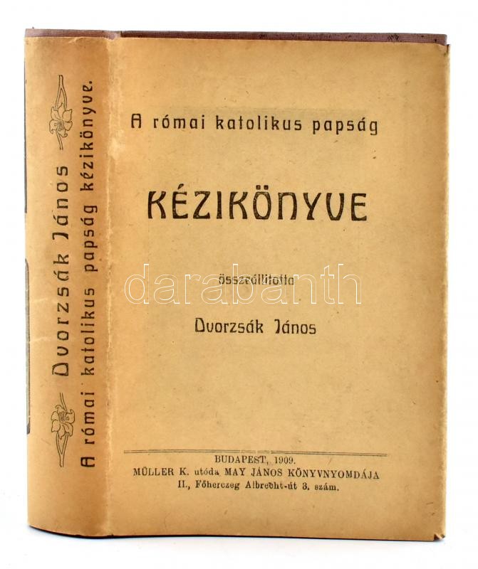 A római katolikus papság kézikönyve. Összeáll. Dvorzsák János. Bp., 1908, Müller K., LXXX+336+40+2 p.+19 sztl. lev. Benne Magyarország római katolikus plébániáinak betűrendes helységnévtárával is. Kiadói illusztrált egészvászon-kötés, Pausz Gyula-kötés, kiadói papír védőborítóban, jó állapotban.