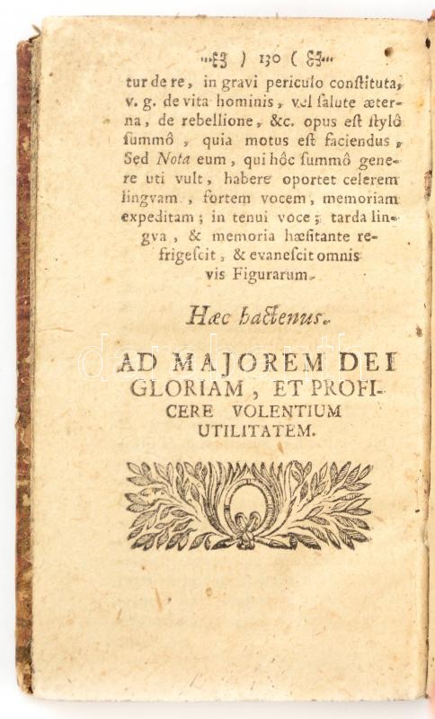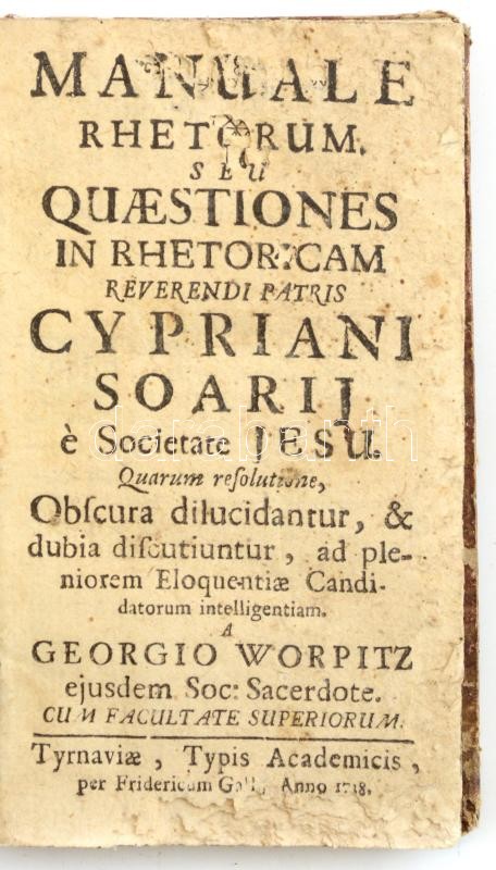 Georg Worpitz: Manuale Rhetorum seu Quaestiones in Rhetoricam Reverendi Patris Cypriani Soarii é Societate Jesu. Tyrnaviae [Nagyszombat], 1718, Typis Academicis, per Friedericum Gall, 130 p. Latin nyelven. Átkötött félbőr-kötésben, kopott borítókkal, a címlap és az első 6 lap szélein, kis sérülésekkel.