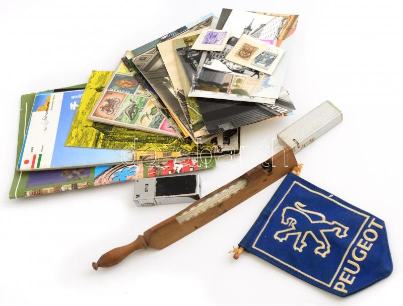 Leírás: Kis bolhapiac tétel, kb. 50 db képeslap, fotó, öngyújtó, fotó, bélyeg, stb.