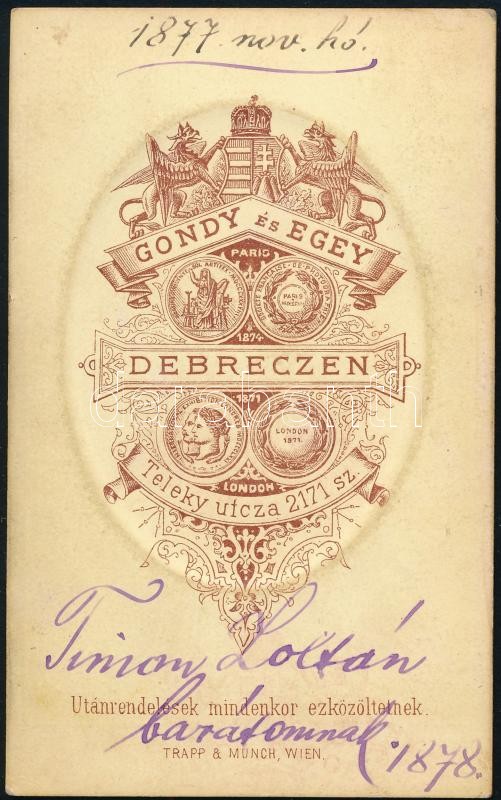 1877 Debrecen, katona portréja, keményhátú fotó, Gondy és Egey műtermé... https://www.darabanth.com/hu/385-Gyorsarveres/385.0/Mutargy-papirregiseg-egyeb/Militaria~1000028/1877-Debrecen-katona-portreja-kemenyhatu-foto-Gondy-es-Egey-mutermebol-ajandekozasi-~II2296963