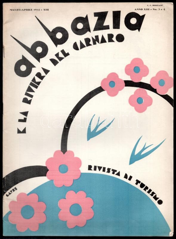 1935 március-április Abbazia e la Riviera del Carnaro, turisztikai folyóirat, borítón art-deco illusztrációval, olasz, magyar és német nyelven. / Touristical magazine on Abbazia and surrounding region, in Italian, German and Hungarian