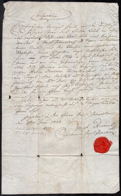 Leírás: 1833 Német nyelvű viaszpecsétes irat