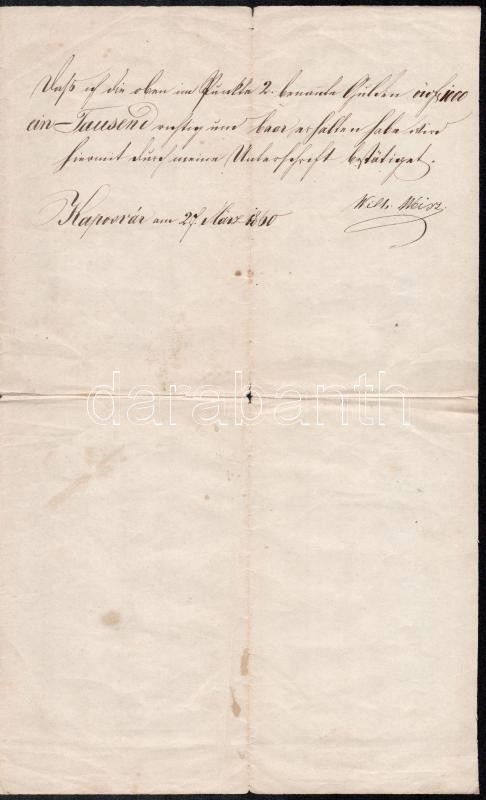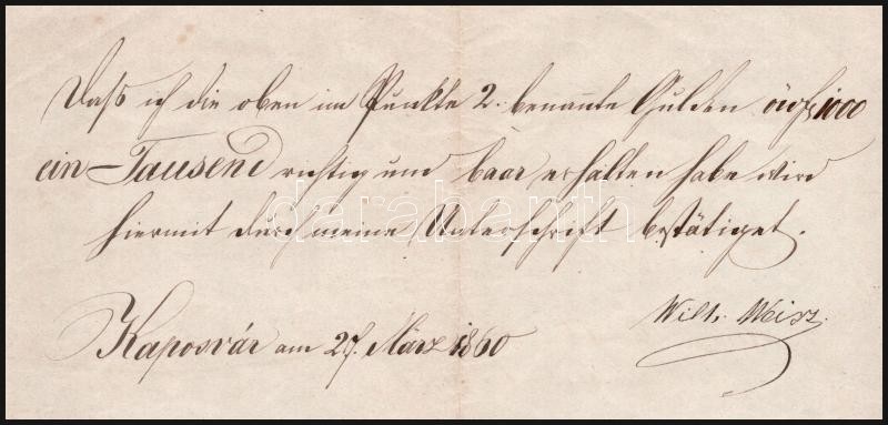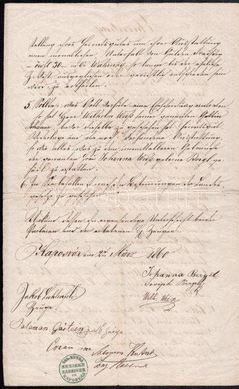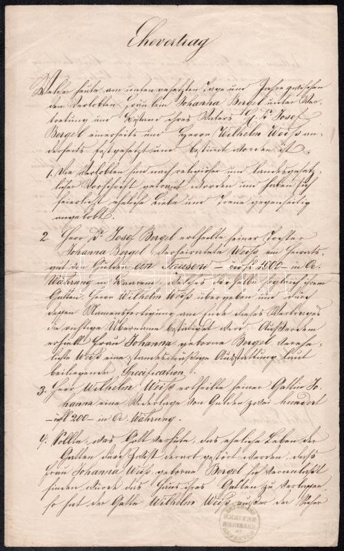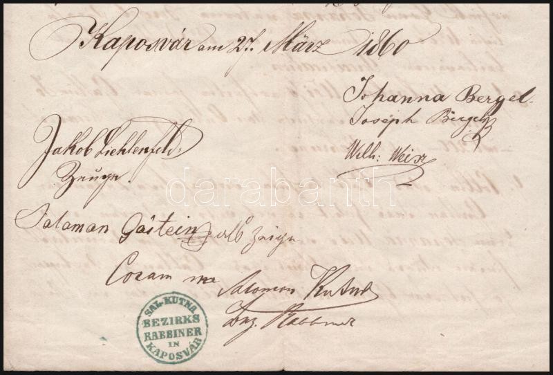 1860 Weisz Vilmos szabómester (későbbi divatáru-kereskedő) és Bergel Johanna, Bergel József orvos és hebraista leánya német nyelvű házassági szerződése, a fentiek saját kezű aláírásával, Salamon Kutna kaposvári kerületi rabbi pecsétjével és aláírásával, jó állapotban, 3p