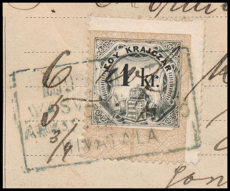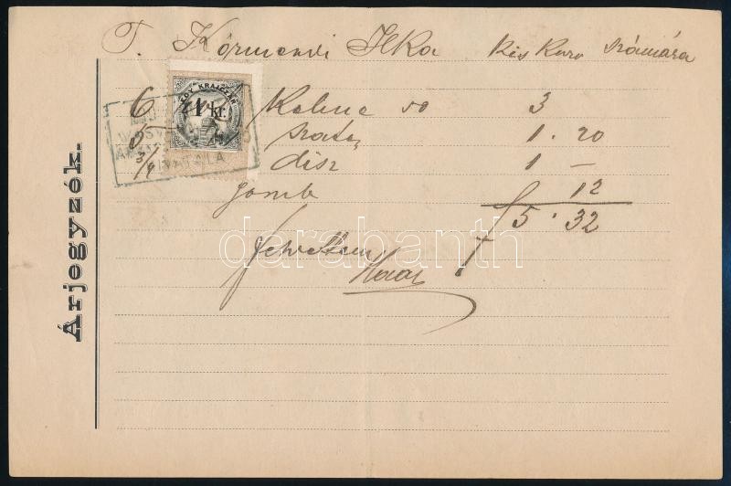 Leírás: 1895 Haas Sándor körmendi divatkereskedő árjegyzék-számlája okmánybélyeggel, hátoldalán rajzos árureklámmal
