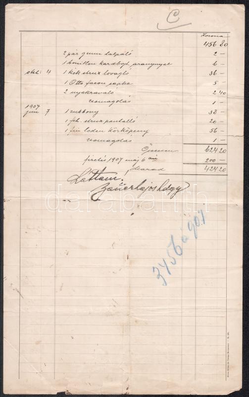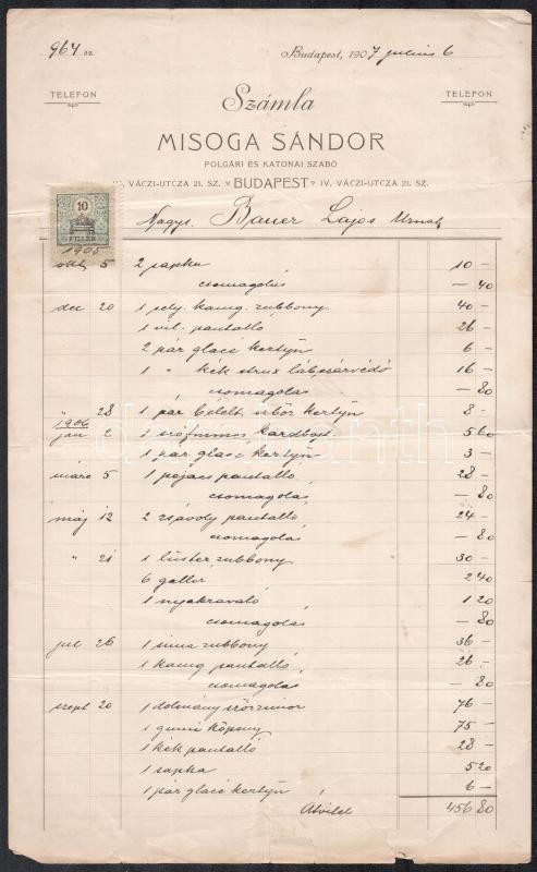 Leírás: 1907 Bp., Misoga Sándor polgári és katonai szabó fejléces számlája okmánybélyeggel