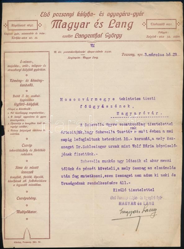 1913 Magyar és Lang Első pozsonyi kályha- és agyagáru gyár fejléces le... https://www.darabanth.com/hu/385-Gyorsarveres/385.0/Mutargy-papirregiseg-egyeb/Okmanyok~1000017/1913-Magyar-es-Lang-Elso-pozsonyi-kalyha-es-agyagaru-gyar-fejleces-levelpapirra-irt-leve~II2301155