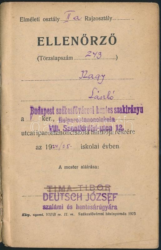 Leírás: 1924 Iparostanonc iskolai ellenőrző hentes szakirány, Tima Tibor Dob utcai hentes