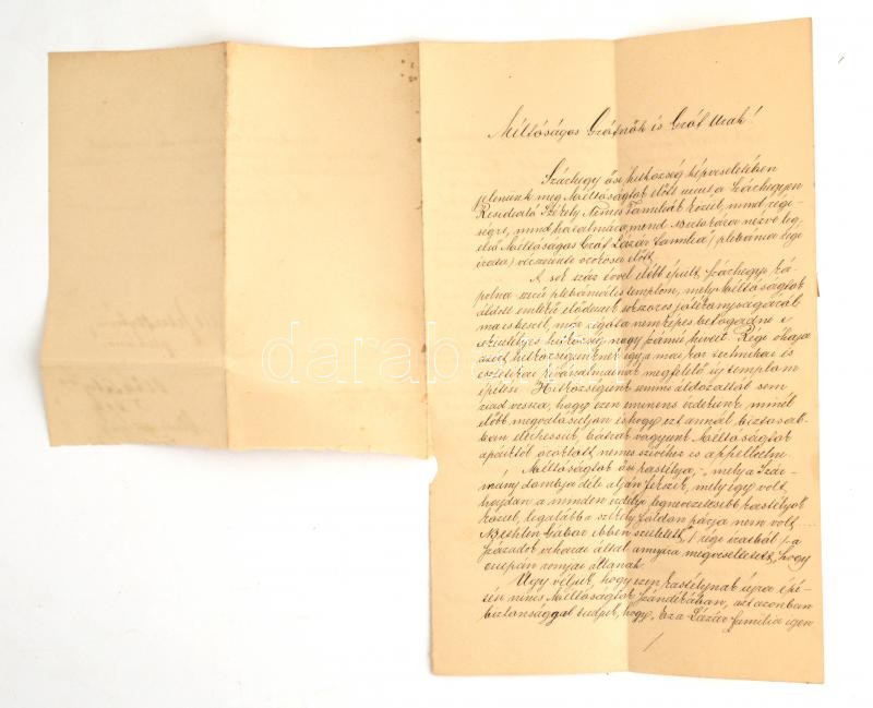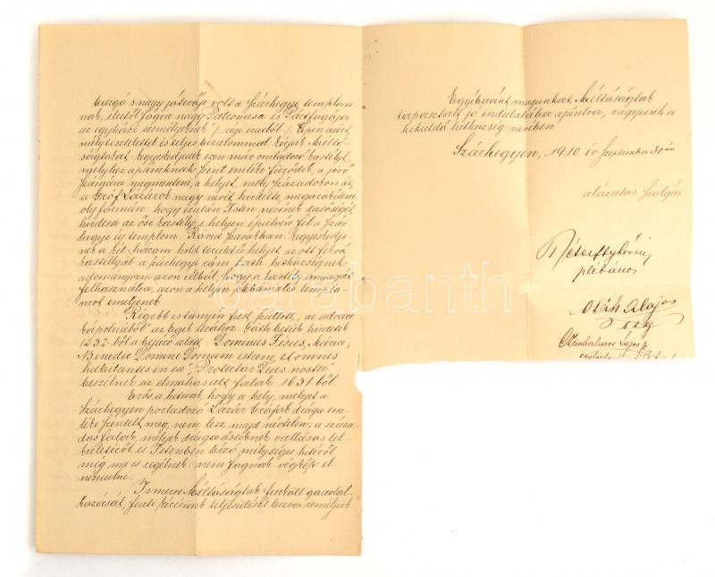 1910 A szárhegyi plédbános és a hitközség elöljáróinak levele a gróf Lázár családhoz, akik korábban is a község nagy támogatói voltak, korábbi érdemeik felemlegetése mellett egy új templom épÃtéséhez hozzájárulásukat kérve. Utolsó lap egy része hiányzik