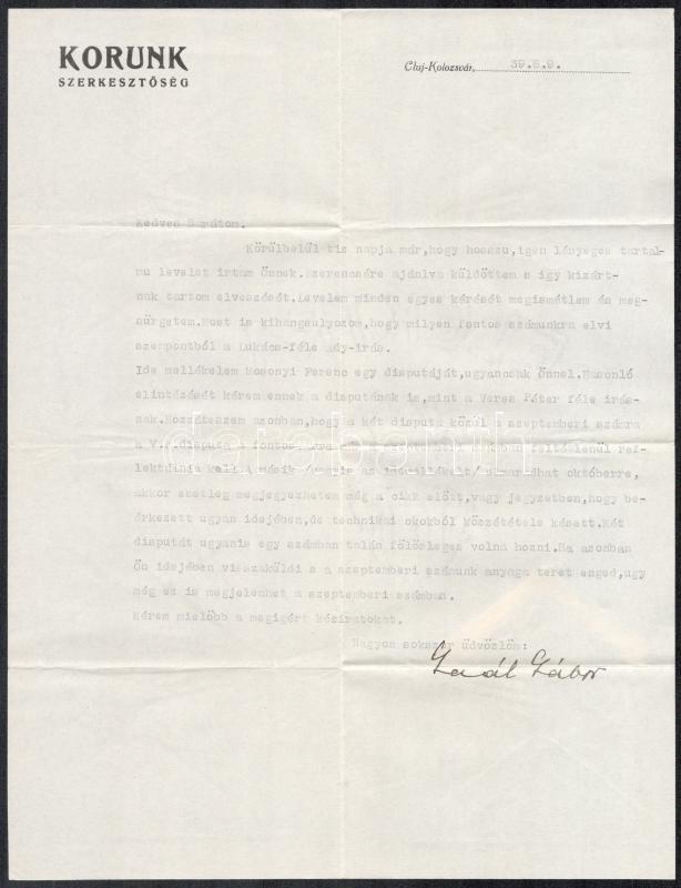 1939 Kolozsvár, Gaál Gábor (1891-1954) Ãró, a Korunk szerkesztÅ‘jének gépelt levele Szekeres György (1914-1973) újságÃró, műfordÃtó, (késÅ‘bb az Európa Kiadó fÅ‘szerkesztÅ‘je) részére, a Korunk folyóirat fejléces papÃrján, saját kezű aláÃrásával, megjelenÅ‘ cikkek, disputák ügyében.