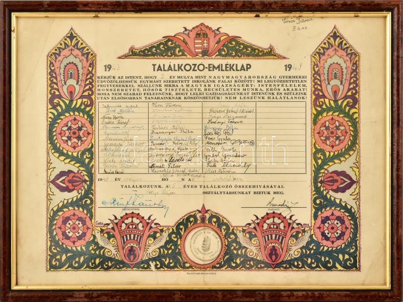 1943 Irredenta szövegű, dekoratív Kispest-munkástelepi (wekerletelepi) m. kir. állami polgári fiúiskolai találkozó emléklap. Sérült, lap alján szakadással. Üvegezett fa képkeretben. 29,5x40,5 cm
