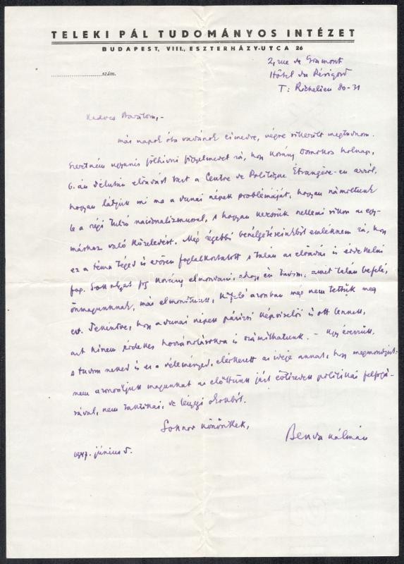 1947 Benda Kálmán (1913-1994) Széchenyi-díjas történész, levéltáros saját kézzel írt levele Szekeres György (1914-1973) újságíró, műfordító, (később az Európa Kiadó főszerkesztője) részére, Teleki Pál Tudományos Intézet fejléces papírján, benne Kosáry Domokos párizsi előadására vonatkozó sorokkal, Benda Kálmán saját kezű aláírásával, dátumozva (1947. jún 5.)