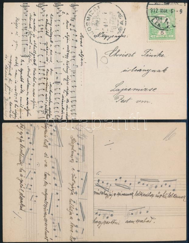 cca 1904-1917 6 db képeslap, rajtuk kottákkal https://www.darabanth.com/hu/385-Gyorsarveres/385.0/Mutargy-papirregiseg-egyeb/Tortenelmi-dokumentumok-keziratok-erdekessegek~1000018/cca-1904-1917-6-db-kepeslap-rajtuk-kottakkal~II2304014