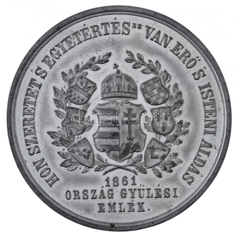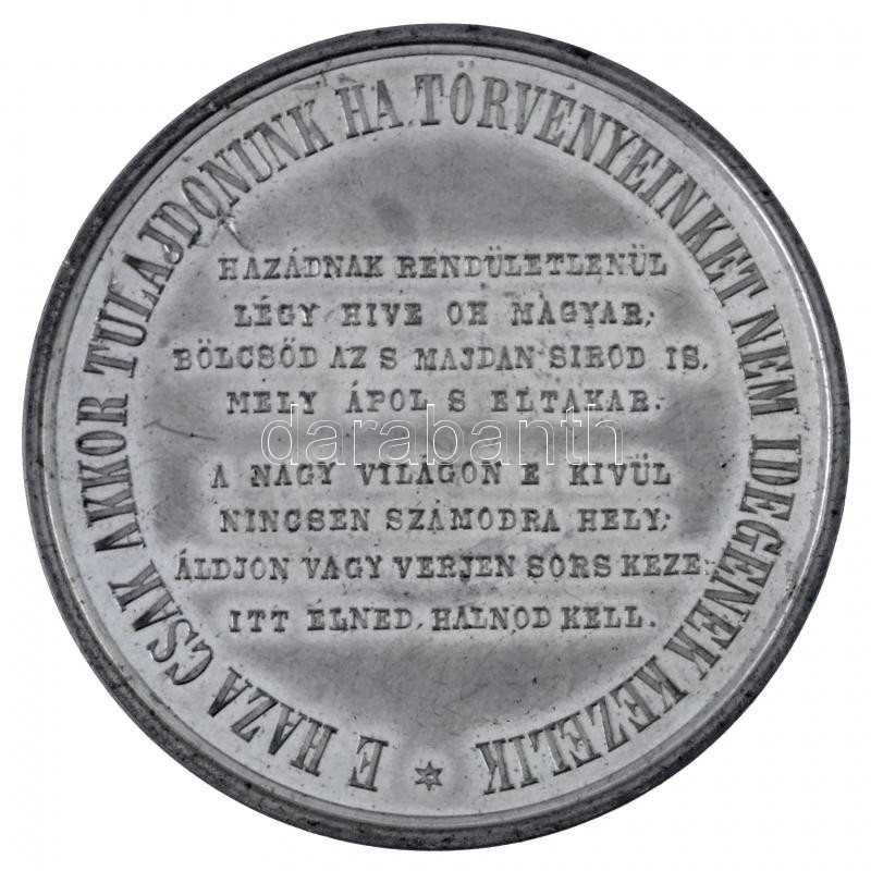 1861. "Országgyűlési Emlék" Sn emlékérem. "HON SZERETET 'S EGYETÉRTÉSBE VAN ERŐ 'S ISTENI ÁLDÁS - 1861 ORSZÁG GYŰLÉSI EMLÉK / E HAZA CSAK AKKOR TULAJDONUNK HA TÖRVÉNYEINKET NEM IDEGENEK KEZELIK - HAZÁDNAK RENDÜLETLENÜL LÉGY HÍVE....". (35,23g/50mm) T:1- Hungary 1861. Sn commemorative medallion of the Diet of 1861. "HON SZERETET 'S EGYETÉRTÉSBE VAN ERŐ 'S ISTENI ÁLDÁS - 1861 ORSZÁG GYŰLÉSI EMLÉK / E HAZA CSAK AKKOR TULAJDONUNK HA TÖRVÉNYEINKET NEM IDEGENEK KEZELIK - HAZÁDNAK RENDÜLETLENÜL LÉGY HÍVE....". (35,23g/50mm) C:AU